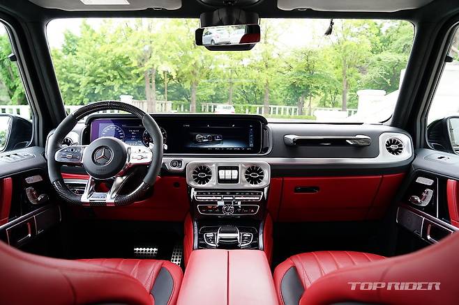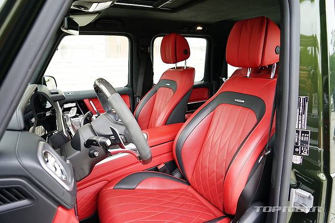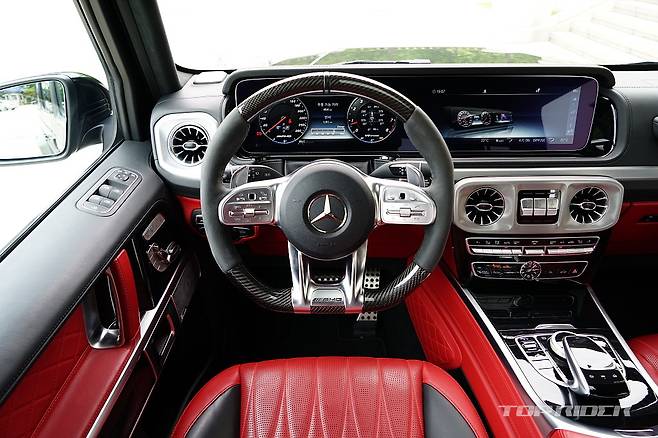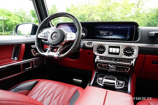시승차의 실내는 익스클루시브 인테리어 플러스가 기본 적용된 G63 에디션 사양으로 다이아몬드 퀼트 시트와 나파 가죽 시트, 에어벤트 실버 크롬, 그리고 대시보드, 도어 센터 패널, 도어 트림, 암레스트에 나파 가죽이 사용된다. 카본/다이나미카 스티어링 휠이 적용됐다.
