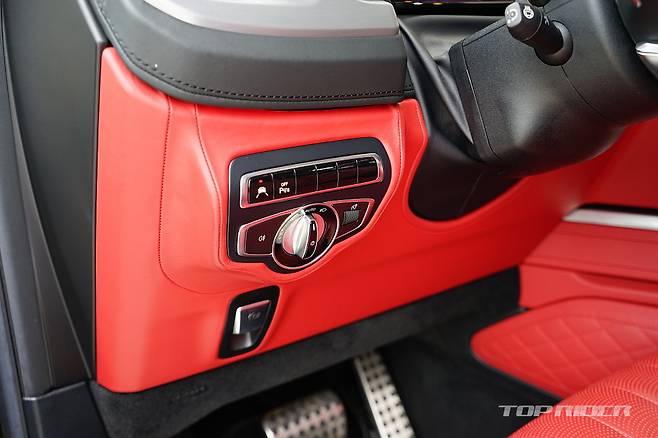 실내에서는 스위치 조작부를 제외하면 대부분 가죽 커버링으로 마감됐다. 단단한 패널에 일체감 높은 가죽과 스티칭의 조합은 수준 높은 마감 완성도를 보여준다. 원형 에어벤트와 금속 느낌의 스위치류, 화려한 컬러와 소재의 고급감은 블링블링한 분위기 그 자체다.