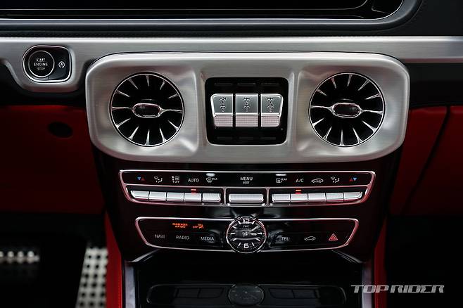 대시보드 정중앙에 위치한 커다란 3개의 스위치는 디퍼런셜 락을 설정하는 버튼으로, 체결 순서는 중앙(1), 후륜(2), 전륜(3)으로 버튼에 새겨진 숫자 순으로 누르면 된다. 디퍼런셜 락 작동시 트레일, 샌드, 락의 주행모드 선택이 가능하다. 락 오프시는 중앙(1) 버튼을 누른다.