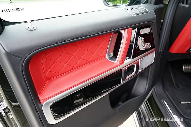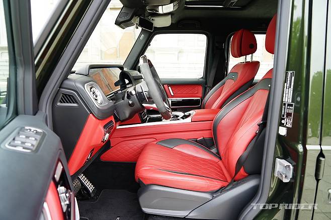 시승차의 실내는 익스클루시브 인테리어 플러스가 기본 적용된 G63 에디션 사양으로 다이아몬드 퀼트 시트와 나파 가죽 시트, 에어벤트 실버 크롬, 그리고 대시보드, 도어 센터 패널, 도어 트림, 암레스트에 나파 가죽이 사용된다. 카본/다이나미카 스티어링 휠이 적용됐다.