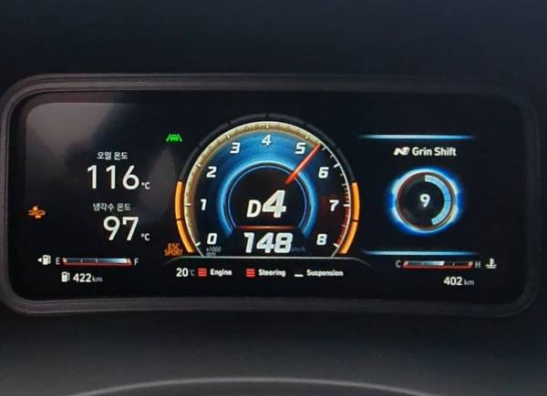 NGS가 활성화된 모습.N브랜드는 SUV인 코나N의 무게중심이 세단, 해치백보다 높다는 단점을 보완하고자 한국의 남양연구소와 독일의 뉘르부르크링 서킷에서 수많은 테스트를 거쳐 서스펜션 설정을 조율했다.