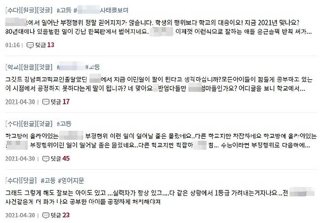 '디스쿨'에는 "학교에 전화해서 항의해야 한다", "말이 되지 않는 이야기다", "숙명여고 쌍둥이 사건과 다를 것이 없다", "학교 이미지에 먹칠이다", "학부모 참관 시험감독이라도 해야할 것 같다", "학교 측의 일 처리가 한심하다"는 등의 의견이 이어졌다.