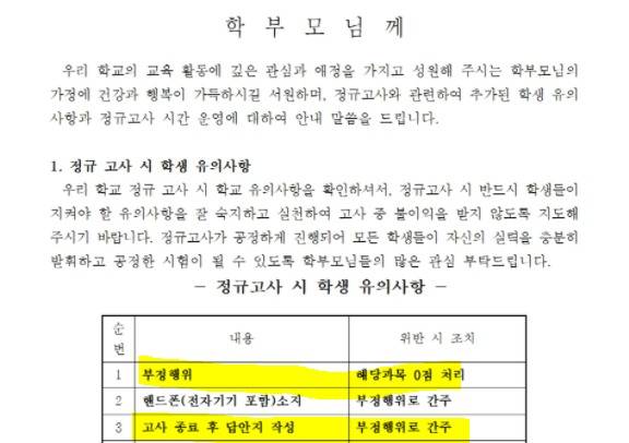 가정통신문에는 "부정행위는 해당 과목 0점 처리를 하고 고사 종료 후 답안지를 작성하는 행위는 부정행위로 간주하겠다"는 내용이 담겼다.