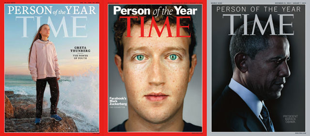 <타임>지가 2019년 올해의 인물로 10대의 스웨덴 환경운동가 그레타 툰베리를 선정했어요. 역대 <타임>지 올해의 인물 표지 이미지를 살펴보면, 대부분 선정된 인물의 얼굴을 크게 부각해요.