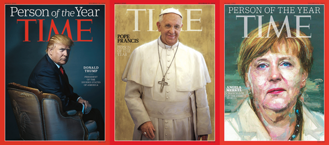 2016년 올해의 인물인 도널드 트럼프의 사진은 등을 보이고 앉은 상태에서 뒤를 돌아보는 모습이에요. 이것은 ‘뜻밖이다’라는 의외성을 표현한 것이에요.