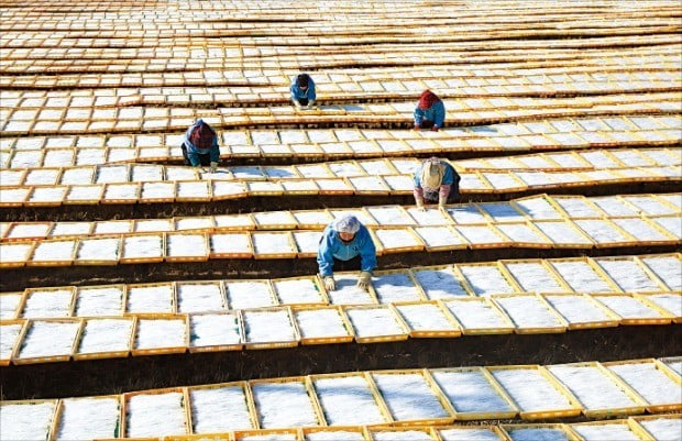 바다에서 채취한 우뭇가사리를 민물로 세척해 소금기를 빼고 햇볕에 말리면 붉은색이 탈색돼 하얗게 변해요.