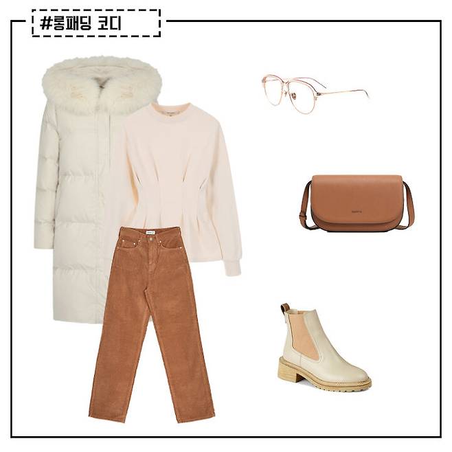베이지 컬러 롱패딩과 비슷한 컬러의 코듀로이 팬츠를