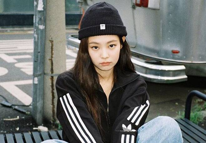 집업 저지와 밝은 워싱의 데님 팬츠, 화이트 스니커즈. 누구에게나 있는 흔한 아이템을 느낌 있게 연출한 비결은 비니에 있어요. 제니처럼 짧은 니트 비니의 끝을 접어 올리고 이마가 절반쯤 드러나게 쓰는 것이 포인트. 한쪽 머리만 귀 뒤로 꽂아 청순함까지 가미한 그녀는 역시 스트리트 퀸!