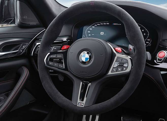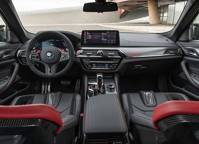 스티어링 휠은 알칸타라로 감쌌다. 시프트 패들은 카본으로 변경됐으며, 운전자가 원하는 주행모드를 바로 불려올 수 있는 M 모드 버튼도 추가된다. 안전벨트는 BMW M을 상징하는 3색으로 멋을 냈다. 이외에 실내 곳곳에 M5 CS 배지가 부착돼 존재감을 부각했다.