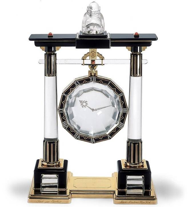 그리고 손목시계는 아니지만, 루이 까르띠에가 마술사인 장-외젠 로베르-우댕(Jean-Eugène Robert-Houdin)의 연구에서 영감을 얻어 디자인하고 저명한 클락메이커 모리스 쿠에(Maurice Coüet)가 1912년부터 제작에 참여한 일련의 미스테리 클락(Mystery clocks)도 특정 디자인과 형태에 집착하지 않고 한계 없는 실험을 이어간 루이 까르띠에의 도전정신을 엿볼 수 있습니다. 미스테리 클락은 일반적인 시계들처럼 핸즈가 다이얼 하부의 무브먼트와 바로 연결돼 있지 않고 마치 다이얼 위에 둥둥 떠있는 듯한 말 그대로 신비로운 작동 원리를 자랑합니다. 여기에는 핸즈를 사이에 두고 양쪽에서 고정하는 두 글라스 디스크에 결정적인 비밀이 숨겨져 있는데요. 글라스 디스크 가장자리에 메탈 프레임과 함께 톱니를 추가해 상단부 무브먼트로 향하는 수직형 기어 트레인과 맞물려 작동케 하는 혁신적인 설계가 돋보입니다.