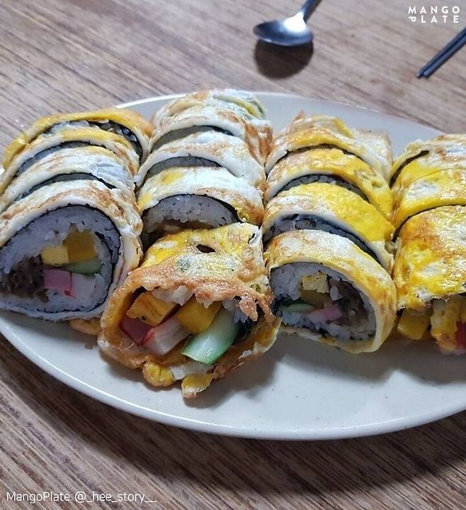 계란말이김밥 전문 분식집. 이곳에 오면 묻지도 따지지도 말고 계란말이 김밥은 주문 필수인데요. 김밥에 계란지단을 입힌 투박한 모양에 씹을수록 계란의 고소한 맛이 도드라져요. 특별한 것 없는 속 재료이지만 쫄면이나 쫄우동과 함께 곁들이면 묵직한 존재감을 나타낸답니다.