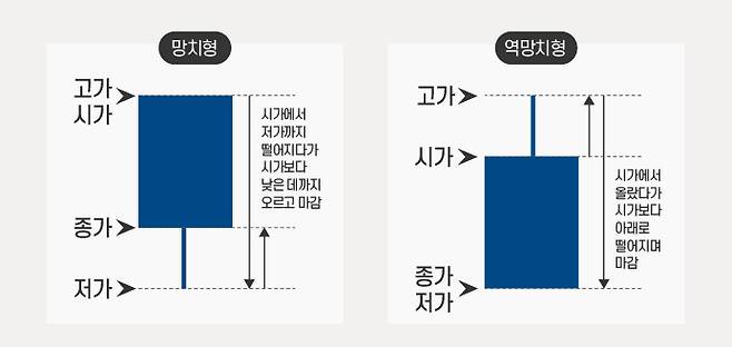 양봉 '망치형'은 최고가가 장중에 시가보다 낮은 가격으로 떨어진 적이 있지만 떨어진 가격으로 매수하는 사람이 많아 그날 시가보다 더 많이 오른 상태로 장이 마감된 경우입니다. 상승 여력이 크다고 해석할 수 있겠죠. 반대로 '역망치형'은 장중에 시가보다 주식 가격이 떨어진 적은 없지만 고가에서 매도하는 사람이 늘면서 주가가 그날 최고가보다 하락한 지점에서 장이 마감된 경우입니다. 상승 이후 시세 차익을 노린 매물들이 나온 경우에도 이런 모양이 되기도 합니다.