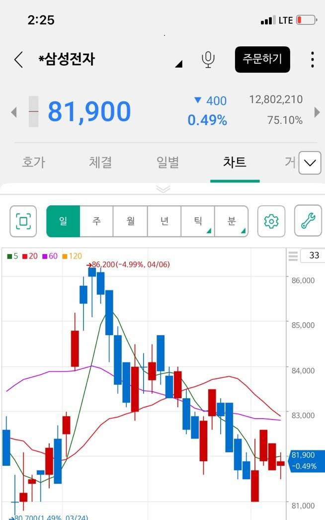 대체로 차트 아래에 막대그래프 형태로 표시되는데요. 봉이 길수록 거래량이 많은 것을 뜻합니다. 거래량 색깔이 빨간색이면 전날보다 거래량이 많음을, 파란색이면 전날보다 거래량이 적음을 의미합니다. 녹색은 보합이고요. (다만 설정에서 바꿀 수 있습니다. 전일 종가 대비 상승/하락 전일 대비 기본 설정돼 있는 경우도 있습니다. 설정 아이콘을 누르면 사실 차트 막대 기준과 색깔을 마음대로 바꿀 수 있습니다.) 색깔은 크게 중요하지 않으니, 헷갈리신다면 높낮이만 주요하게 보면 될 것 같습니다.