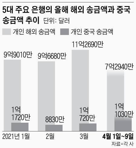 실제로 KB국민, 신한, 우리, 하나 등 시중 4대 은행과 농협에서는 이달 들어 중국으로 보내는 외화 송금액이 급증했다. 4월 1일부터 9일까지 5개 은행의 개인 해외 송금액은 7억2940만달러(약 8023억원)이고 이 중 중국으로 송금된 돈이 1억1030만달러(약 1213억원)로 15%를 차지했다. 특히 이번 달 9일간 중국으로 송금된 금액은 지난 한 달 송금액(1억720만달러)을 넘어섰다.