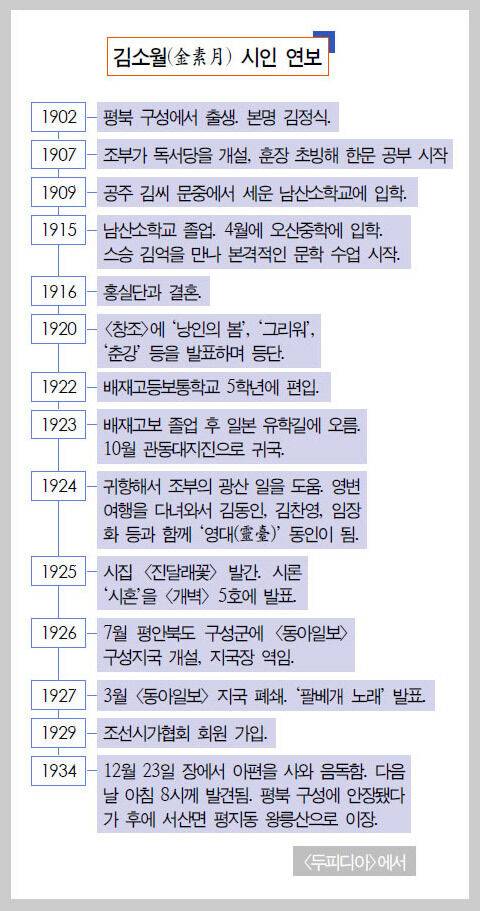 소월의 삶은 32년 남짓이다. 열여덟에 등단했으니 실제 작품활동을 한 기간은 고작 14년 정도다. 그런데도 그는 이 나라 사람 가운데 그의 이름을 모르는 이가 드문, ‘국민시인’이라 부를 만한 인물이니 그의 요절이 한층 더 안타까운 것이다.