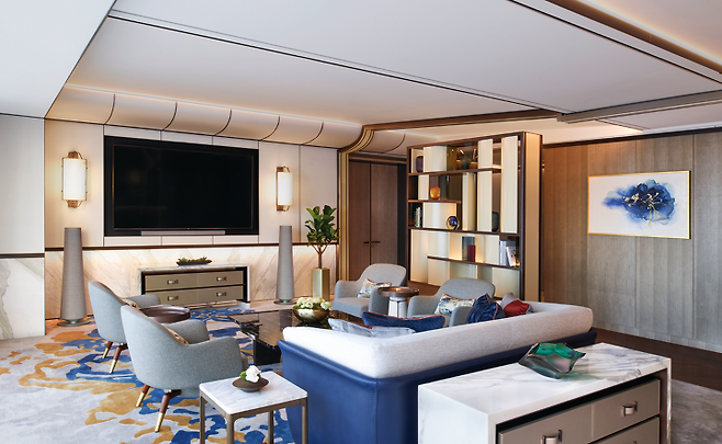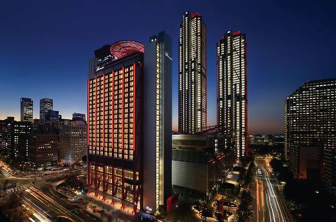 2월 24일 문을 연 페어몬트 앰배서더 서울은 퐁피두센터, 밀레니엄 돔 등을 설계한 유명 건축가 리처드 로저스 Richard Rogers가 디자인한 대형 복합 문화 단지 파크원 내에 있다. 가장 먼저 눈길을 끄는 것은 전통 목조 건축물에서 영감을 얻은 붉은색 노출 철골조. 강렬한 단청 색을 연상시키는 이 구조는 전통과 미래를 아우른 디자인으로 눈길을 끈다 . 내부 역시 그명성에 걸맞은 규모와 미감을 자랑한다. 인테리어 디자인 전반을 맡은 윌슨 어소시에이츠 Wilson Associates는 ‘젠틀맨의 서울 ’이란 아이디어로 공간을 풀어나갔는데 , 건물 외관에서 풍기는 아우라를 이어받아 전통적 요소를 현대적으로 재해석했다. 이들은 도산서원, 한옥, 그리고 흥미롭게도 전통 장난감인 딱지에서 디자인 영감을 얻었다. 도산서원의 기풍과 전통의 품격을 반영하는 한편 한옥의 유려한 곡선미를 반영해 홀 지붕의 레이아웃과 로비의 샹들리에를 디자인했다. 또 공간 전반에 걸쳐 적용한 벽면과 조명 설비는 딱지놀이의 추억과 노스탤지어를 모던한 형식으로 표현한 것.