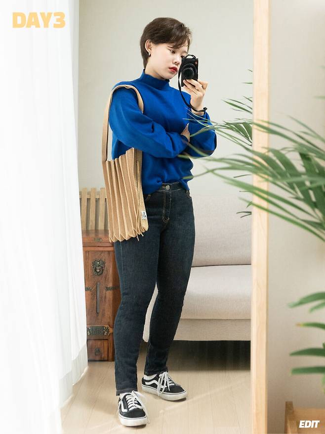 어두운 컬러의 생지데님은 니트는 물론