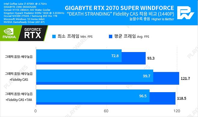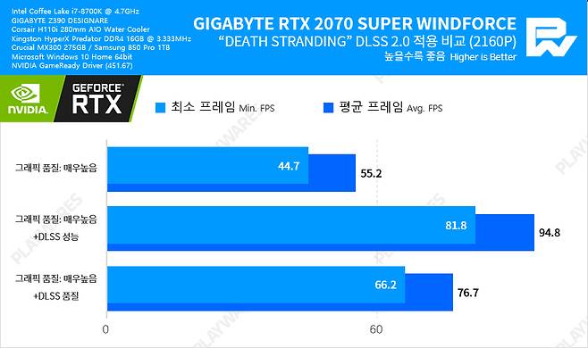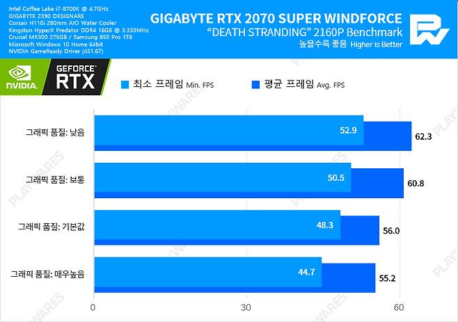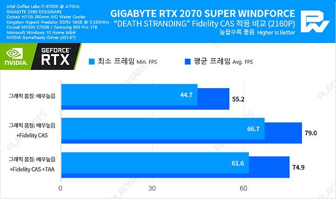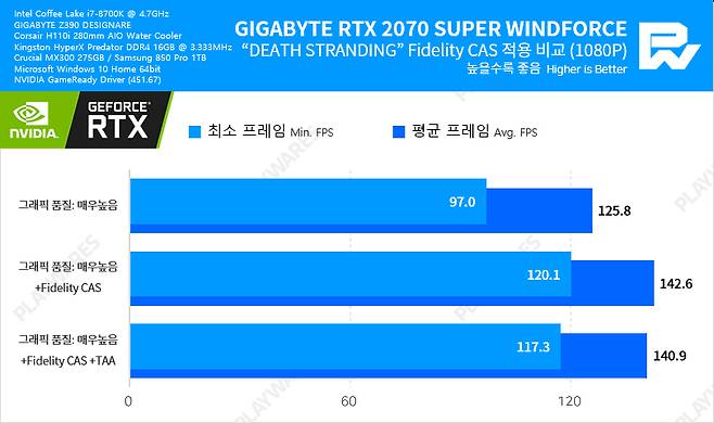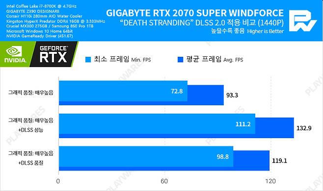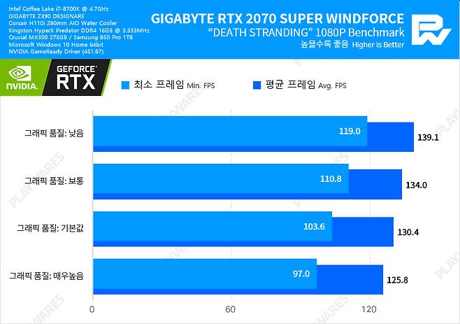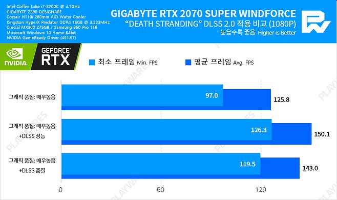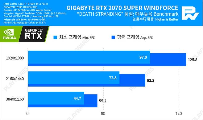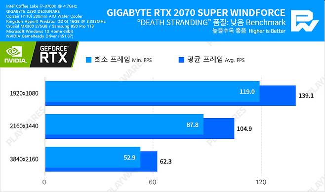 AAA급 게임인 만큼 기본적인 요구 사양이 결코 낮은 편은 아니지만... 권장 사양인 GTX 1060이나 RX 590이라면 1080P + 매우 높음 품질로 평균 60FPS 이상이 가능하며, 압도적인 효율을 자랑하는 DLSS 2.0 성능 옵션을 사용할 경우 RTX 2060 SUPER 이상부터 2160P + 매우 높음 품질로 평균 60FPS 이상이 가능합니다. 본 리뷰에 활용된 GIGABYTE GeForce RTX 2070 SUPER Gaming OC D6 8GB 화이트라면 어떠한 시스템에서도 데스 스트랜딩을 즐기는데 아무런 걱정이 필요없을 정도입니다.