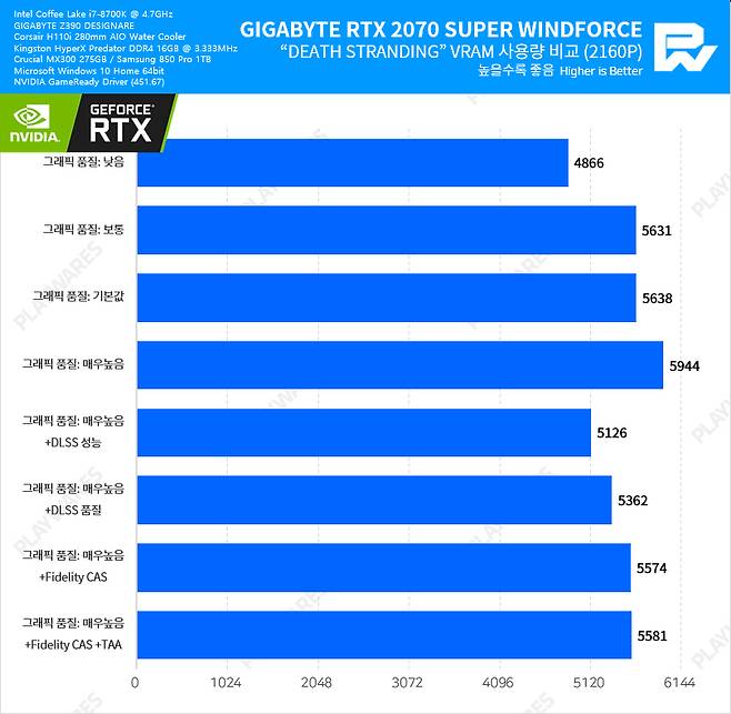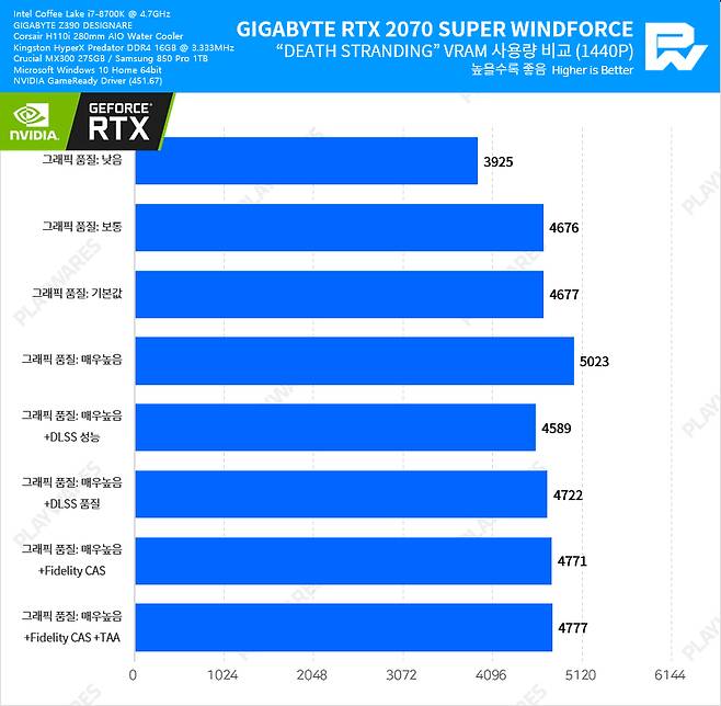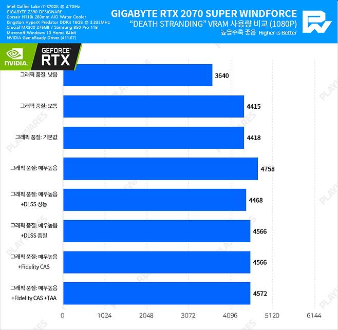 전반적으로 1080P, 1440P 환경에서 그래픽 품질: 낮음으로 플레이하는게 아닌 이상 데스 스트랜딩을 원활하게 즐기기 위해서는 VRAM 6GB를 갖춘 그래픽 카드가 필수적이겠습니다. DLSS를 지원하는 RTX 2060부터는 기본적으로 6GB이기 때문에 NVIDIA GeForce RTX 그래픽 카드 사용자라면 VRAM에 대한 걱정은 할 필요가 없겠습니다.