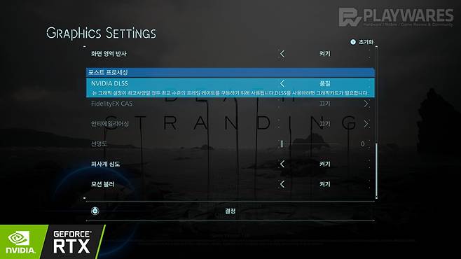 DLSS 2.0은 끄기 / 성능 / 품질의 3가지 단계로 구분되며, DLSS 옵션을 켜면 FidelityFX CAS 옵션과 안티에일리어싱 옵션이 비활성화됩니다.