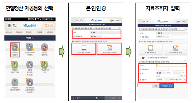 - 모바일 홈택스 > 신청/제출 > 연말정산 제공동의 > 제공동의 신청