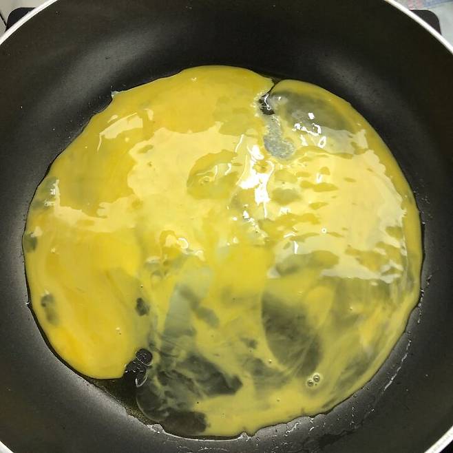 우선 기본 오므라이스는 달걀 2개를 풀어 기름을 살짝 넣은 팬에 넓게 펴고 익혀줌