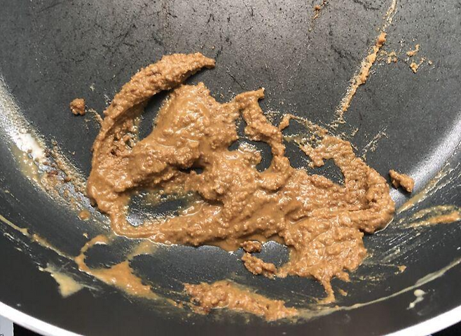 먼저 소스를 만드는데 식용유 2큰술, 밀가루 1큰술 넣고 약불로 볶아줌! 흰색의 밀가루가 갈색으로 변하면 루 완성!