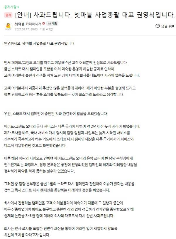 이어 "담당 본부장은 종전에 진행되었던 캠페인의 취지와 디테일한 내용을 정확하게 파악하지 못하고 스타트 대시 캠페인을 중단하는 이례적인 결정을 했다"며 "회사에서 진행하는 캠페인은 고객 여러분과의 약속이기 때문에 진행과 중단에 매우 신중했어야 함에도 불구하고, 충분한 상의 없이 성급하게 캠페인을 중단함으로 인해 현재의 논란을 자초한 점에 대하여 회사의 대표로서 다시 한번 사과드린다"고 밝혔다.