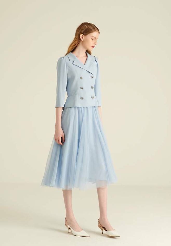 발레리나의 튤(tulle)스커트를 연상시키는 디자인의 샤 스커트는 다소 절제된 무드의 라이더 재킷, 트위드 재킷 등의 아우터와 레이어드하면 단아한 듯 여성스러운 페미닌룩으로 각광받고 있다.