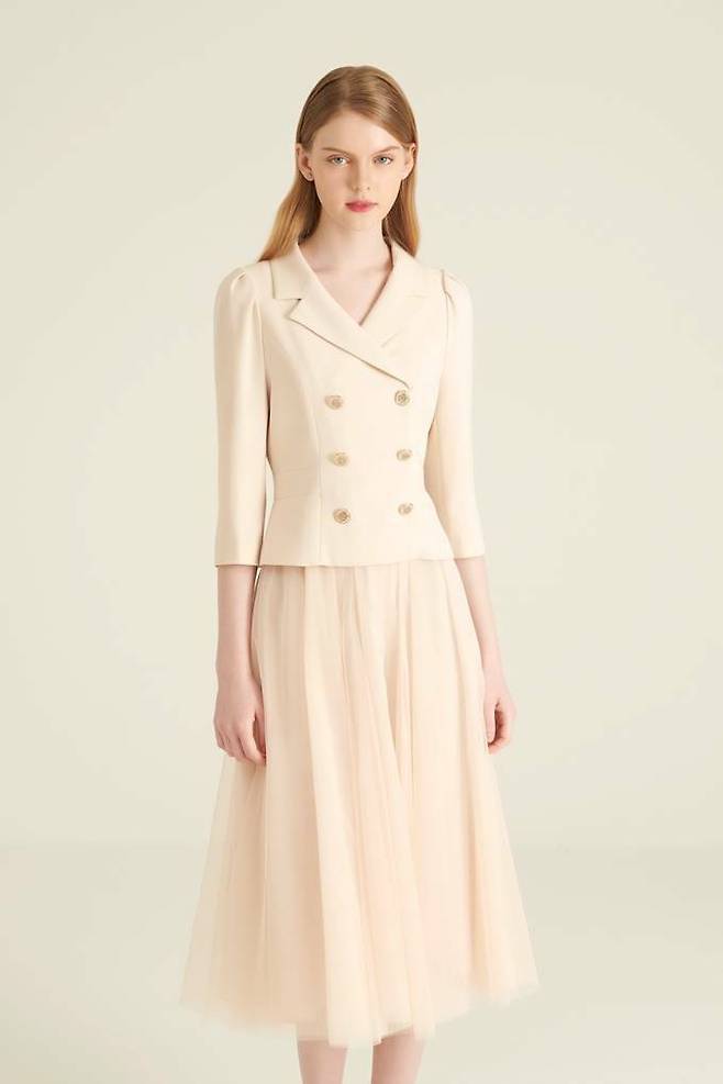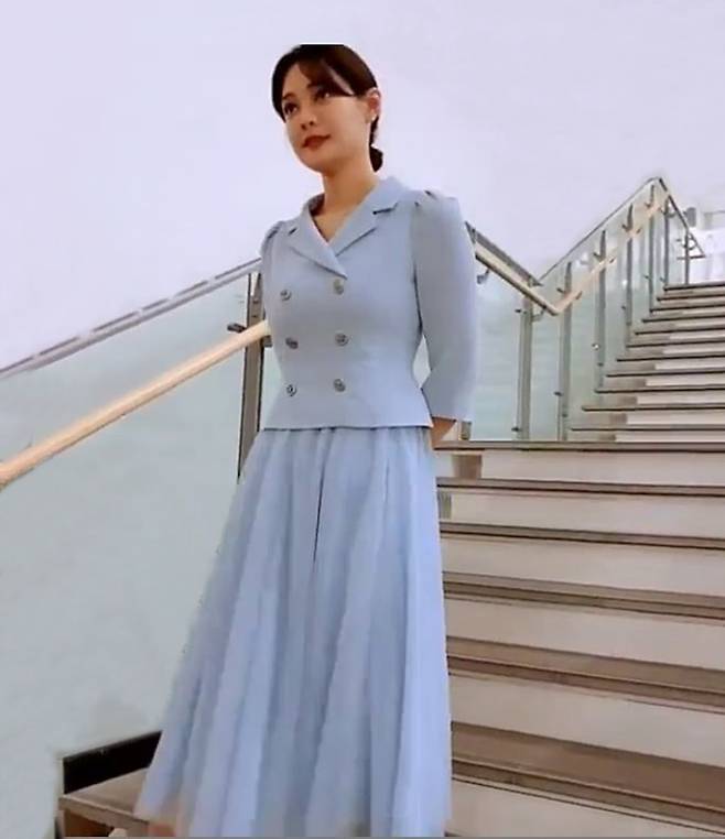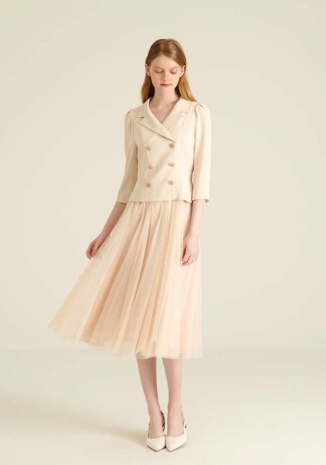 오윤아가 착용한 샤 스커트 원피스는 로맨틱 페미닌 브랜드 '샤틴(SATIN) 제품으로 숏한 기장감의 칠부 재킷과 풍성한 샤 스커트가 덧대어져 페미닌하지만 단정한 이미지를 연출한다.