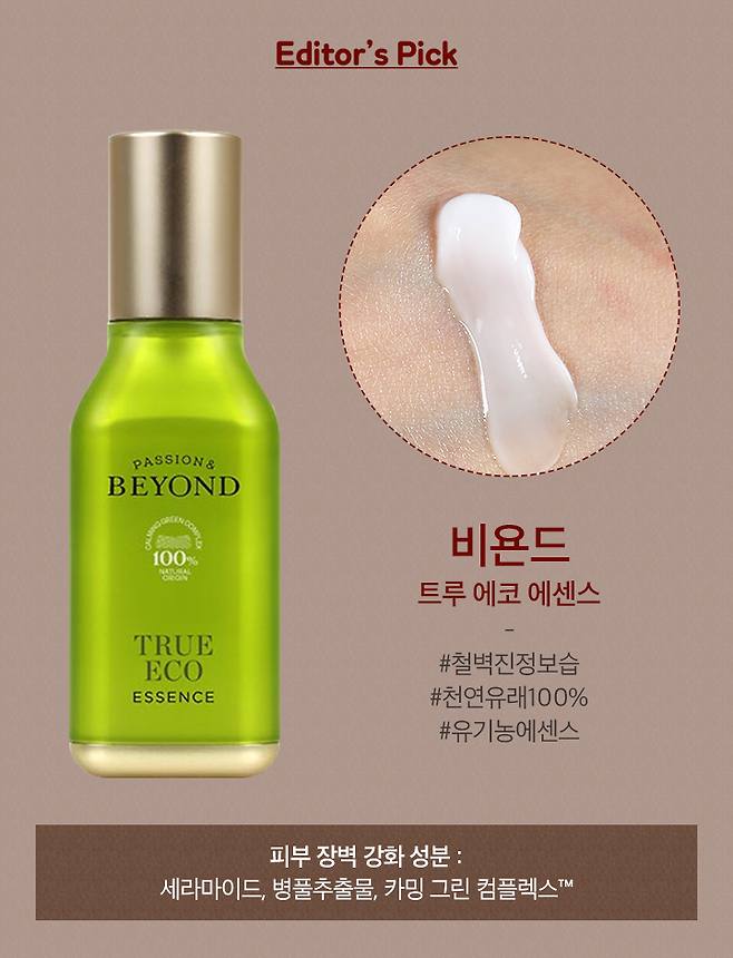 비욘드 트루 에코 에센스는 100% 천연 유래 원료로 안심하고 사용할 수 있는 유기농 제품인데요. 피부 장벽 강화에 도움이 되는 세라마이드 성분과 병풀추출물이 함유되어 있어 피부의 긴장을 풀어주면서 편안하게 진정시켜줘요. 워터 타입이 아닌 영양감이 풍부하게 느껴지는 제형으로 흡수가 빨라 바른 직후에도 끈적이지 않아 마음에 쏙 들었던 에센스에요.