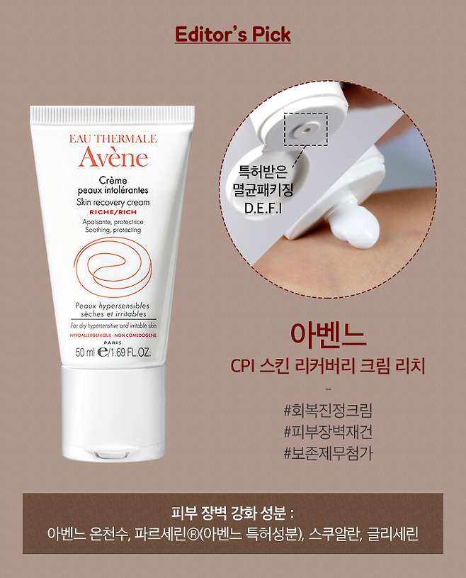 유수분 밸런스 조절을 위해 추천해드리고 싶은 제품은 바로 아벤느 CPI 스킨 리커버리 크림 리치에요. 보존제를 빼고 피부를 건강하게 변화시켜주는 회복 크림인데요. 아벤느만의 특허 멸균 용기로 보존제, 살균제 없이도 개봉 후에도 처음과 동일한 포뮬라 상태를 유지할 수 있다고 해요. 특히 피부에 꼭 필요한 16가지의 최소 성분만으로 만들어 민감한 피부도 안전하게 사용할 수 있어요. 참, 멸균 패키징 된 제품이라 다 사용한 후에 용기를 잘라서 쓰게 되면 외부 공기가 닿아 오염될 수 있으니 참고하세요!