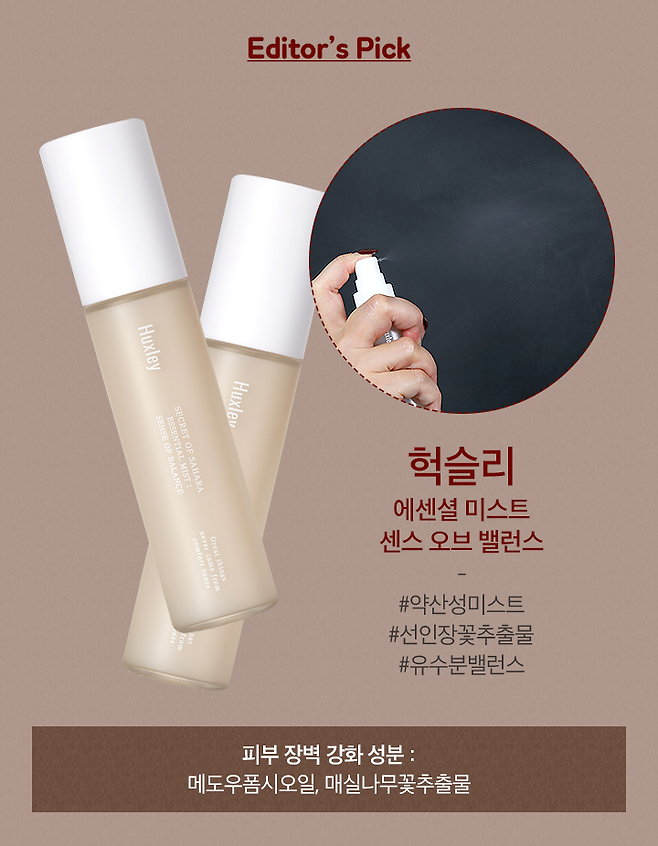에디터는 약산성 미스트인 헉슬리 에센셜 미스트 센스 오브 밸런스를 주로 사용하고 있어요. 1년에 단 한 번 극소량만 수확 가능한 '선인장꽃 추출물'이 함유되어 있어 즉각적인 수분을 피부에 공급해주고 진정시켜주는 제품으로 유수분 밸런스를 조절하여 피부의 이상적인 균형을 맞춰줘요. 35ml 사이즈로 휴대하기도 좋아 피부가 건조하다 싶을 때 수시로 뿌려주고 있는데, 분사력이 안개처럼 고와서 뭉침 없이 피부에 밀착돼요. 피부가 건조해 수분이 필요하다, 산뜻한 미스트를 원한다면 헉슬리 에센셜 미스트 센스 오브 밸런스 사용해보세요!