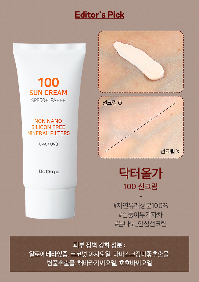 피부를 자외선으로부터 보호하기 위해 에디터가 365일 바르고 있는 닥터올가 100 선크림이에요. 겟잇뷰티 2019 무기자차 선크림 부문에서 최종 뷰라벨 TOP1으로 선정되기도 했으며 병풀추출물과 해바라기씨 오일, 코코넛 야자오일 등 피부 장벽 강화와 보습에 도움이 되는 성분이 함유되어 있어 피부 기초 체력을 튼튼하게 해주는 제품이에요. 무기자차 선크림이지만 백탁 현상이 거의 없고 부드럽게 발리면서 자연스럽게 윤광 표현이 되어 더욱 손이 가더라고요. 가을 자외선이 제일 무섭다고 하잖아요. 닥터올가 100 선크림으로 가을 자외선을 차단하고, 지치고 푸석해진 메마른 피부에 촉촉함을 주자고요! 피부 무자극 테스트까지 완료하여 누구나 안심하고 사용할 수 있답니다.