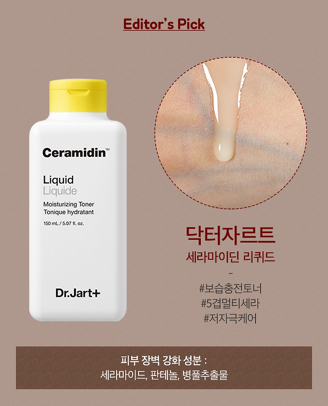 에디터가 피부결 케어를 위해 사용하고 있는 제품은 바로 닥터자르트 세라마이딘 리퀴드로 메마른 피부를 촉촉하게 개선해주는 보습 충전 토너에요. 닥터자르트만의 '5겹 멀티 세라'로 피부 장벽을 깨지지 않는 보습 장벽으로 만들어 외부 환경에서도 수분 증발이 잘되지 않도록 도와줘요. 요즘 피부가 너무 건조하다, 거칠다 싶으면 닥터자르트 세라마이딘 리퀴드로 저자극 보습 케어 해보세요!