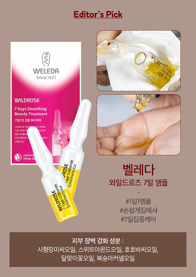 벨레다 와일드로즈 7일 앰플은 집에서 손쉽게 집중 케어 할 수 있는 제품으로 단기간에 피부의 탄력과 윤기를 회복시켜줘요. 에디터는 요즘같이 환절기나 피부가 급속하게 안 좋아졌을 때 세안 후 피부에 벨레다 앰플을 발라 부드럽게 마사지해주고 있어요. 집중 관리를 해주고 나면 뭔가 피부가 매끈해지고 코팅된 느낌이 들더라고요. 피부 장벽을 튼튼하게 해주는 호호바씨오일, 사향장미씨오일 등 식물 에센셜 오일로 구성된 앰플은 피부 자체의 회복을 도와 피부를 건강하게 가꿔주니 요즘 피부 때문에 고민이 많다면 벨레다 와일드로즈 7일 앰플로 집중적으로 관리해 보세요!