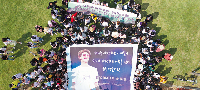방탄소년단 멤버 RM의 26번째 생일(9월 12일)을 기념해 팬들이 보낸 축하 선물은 특별했어요. 그의 팬 250여 명은 8월 31일 서울 잠실 한강공원에 ‘RM 숲 1호’를 조성했어요.