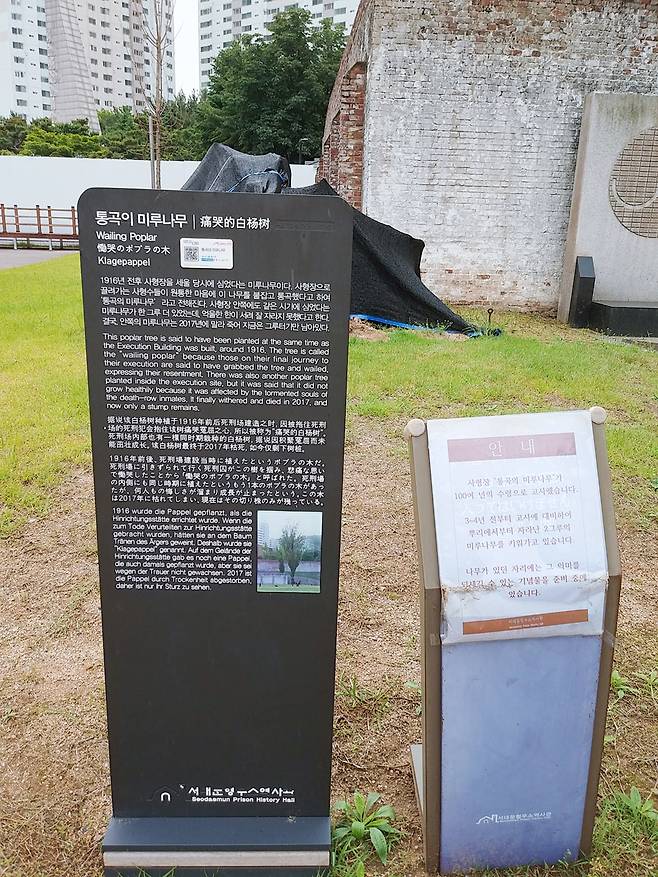 한센병사, 격벽장(수감자들의 야외 운동 공간. 좁고 긴 벽으로 분리해 수감자들끼리 소통할 수 없도록 차단), 추모공간 등을 쭉 둘러본 뒤 마침내 가장 가슴이 먹먹해지는 곳, 사형장으로 향했다. 사형장 앞에는 ‘통곡의 미루나무’라 불리는 큰 나무가 서 있었는데, 지난해 수명을 다하고 말라 죽었다. 1916년 전후 사형장을 만들 당시에 심었다는 이 나무는 사형수들이 붙들고 오열했다고 하여 이런 이름이 붙었다고 한다. 사형장 담장 안쪽에도 같은 시기에 심은 미루나무가 있었으나 한이 서려서인지 제대로 자라지 못했다고 전해진다. 지금 역사관 측에서는 ‘통곡의 미루나무’와 똑같은 그루터기에서 자란 나무를 키워가고 있다.