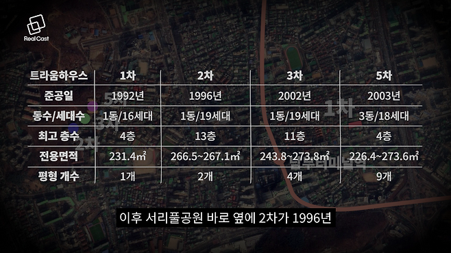 서울 서초구 서초동에 위치한 트라움하우스는 1, 2, 3, 5차로 구성됐습니다. 남부터미널역 인근에 위치한 1차는 1992년 준공됐으며, 이후 서리풀공원 바로 옆에 2차가 1996년, 3차와 5차는 각각 2002년과 2003년 자리를 잡았습니다.