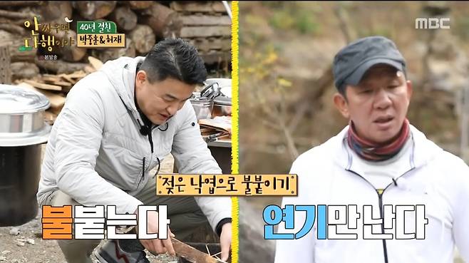 허재는 "잔 가지를 넣어야 한다"고 했지만 박중훈은 휴지를 태우며 연기만 피웠다. 1시간 동안 실랑이를 벌인 후 허재는 "배우를 30년 했는데 왜 성격이 급하냐"며 핀잔을 주면서도 직접 잔가지 만들어 던져줬다. 허재의 도움으로 불을 붙인 박중훈은 "그만 야단쳐"라며 귀엽게 미소를 보였다.