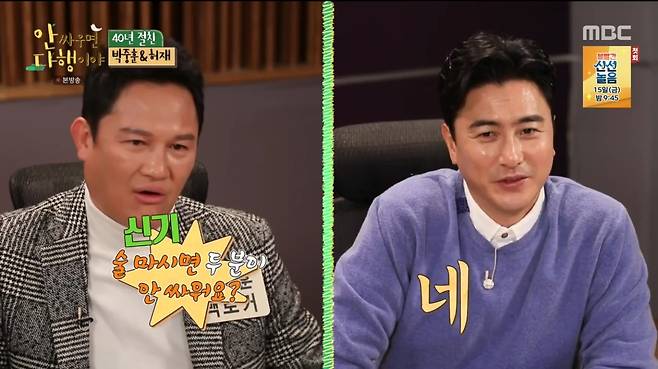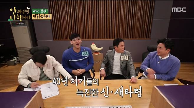 11일 오후 방송된 MBC '안싸우면 다행이야'에서는 배우 박중훈과 농구감독 허재의 자급자족 야생 적응기가 공개됐다. '빽토커'는 두 사람의 절친인 배우 강성진, 농구선수 하승진이 함께했다.