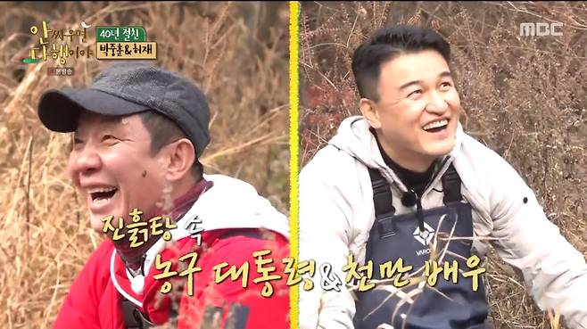 허재와 박중훈은 진흙을 파며 산 미꾸라지에 나섰다. 삽질에 피로를 느낀 허재는 "네가 파고 내가 잡자"면서 자신에게 유리한 역할 분담을 요구해 웃음을 자아냈다. 그렇게 말했지만 결국 삽질은 더 잘하는 허재가 자연스럽게 하게 됐고, 박중훈이 미꾸라지를 놓치자 서로에게 비속어를 쏟아내며 절친 면모를 드러냈다. 이를 보던 안정환은 "엄청나게 '신-새타령'을 한다"며 폭소했다.