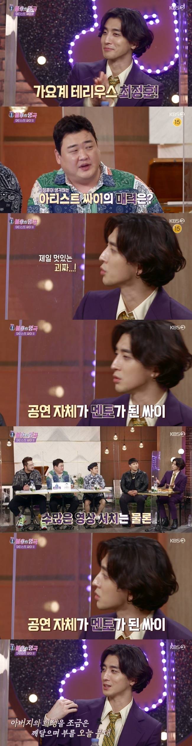 최정훈은 싸이의 ‘아버지’를 선곡했다. 그는 “어렸을 때 나온 노래라서 아버지랑 노래방 가면 저희 형제가 노래를 불러드렸다. 그때는 노랫말의 뜻을 어떻게 알겠나. 이제는 조금씩 깨닫는 것 같다”고 설명했다.