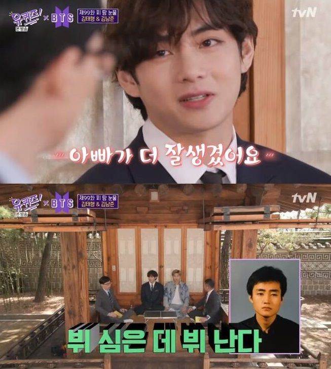 tvN '유 퀴즈 온 더 블록'에서 뷔의 아버지의 젊은 시절 모습도 공개됐습니다. 뷔는 "아빠 옛날 사진 보면 아빠가 더 잘생겼다"고 했습니다. 뷔는 "내 꿈은 아빠"라면서 "성격도 아빠 같은 사람이 되고 싶다"고 바람을 밝혔습니다.