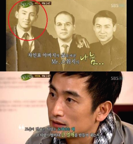 차인표는 SBS '힐링캠프, 기쁘지 아니한가'에서 아버지와 형 사진을 공개하며 가족들을 소개했습니다. 차인표 아버지의 반듯한 이목구비가 시선을 사로잡았습니다. MC 한혜진 김제동은 "진짜 잘생겼다. 미남이다"며 가장 왼쪽에 위치한 차인표 아버지 사진에 눈을 떼지 못했습니다.