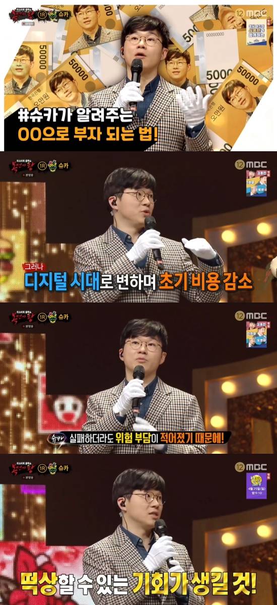 18일 방송된 MBC '복면가왕'에서는 '판정단 분들 제 노래에 투자하세요 재테크'의 정체가 슈카로 밝혀진 장면이 전파를 탔다.