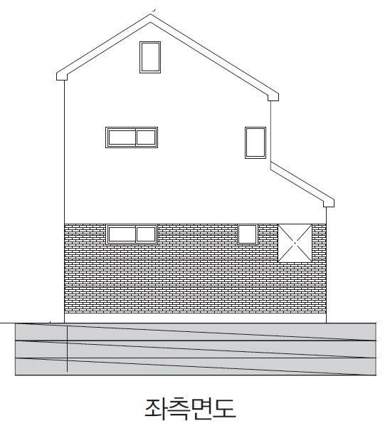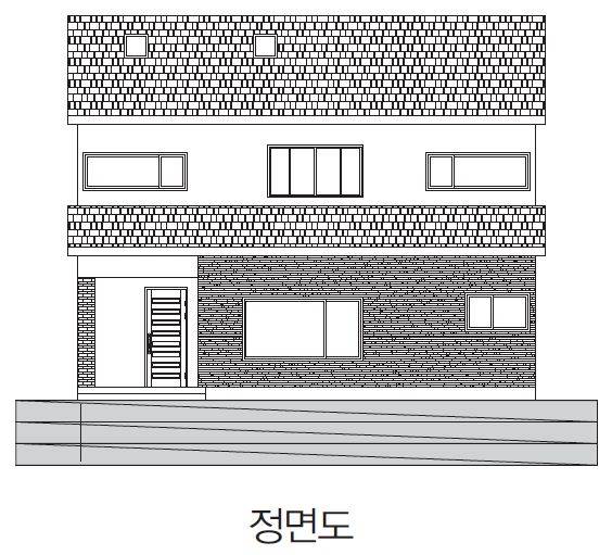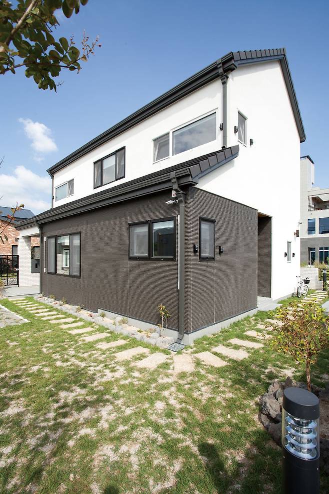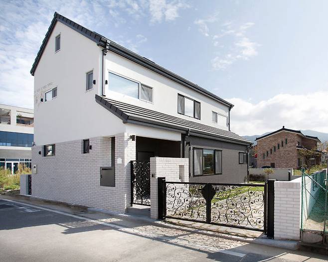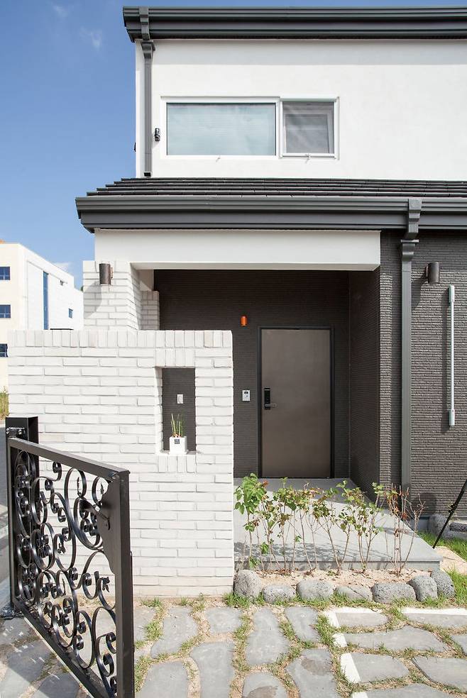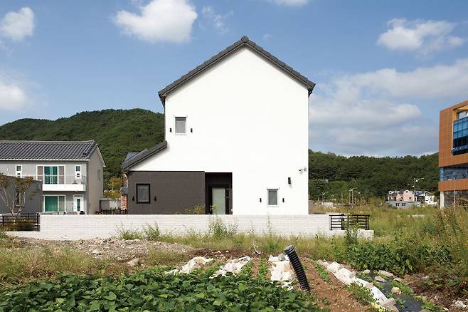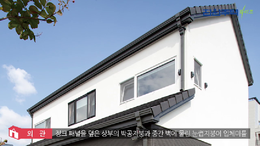 입면은 모던하고 심플하면서 징크 패널을 덮은 상부의 박공지붕과 중간 벽에 물린 눈썹지붕이 입체미를, 외장재인 화이트 톤의 스타코 플렉스와 벽돌, 다크 그레이 톤의 세라믹 사이딩이 조화미를 자아낸다. 또한, 도로와 현관이 근접해 있어 프라이버시를 확보하기 위해 현관 앞에 반가 한옥의 내외담처럼 쌓은 담이 돋보인다.