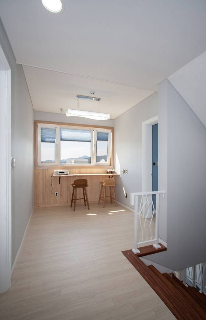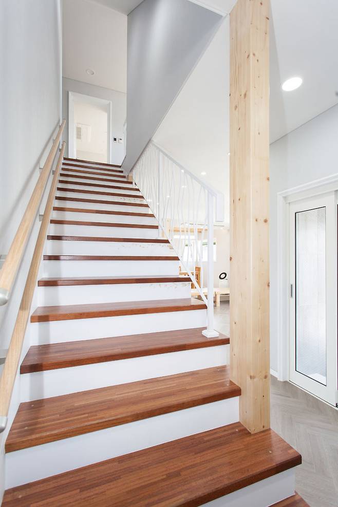 1층과 2층을 잇는 계단실은 일자형으로 화이트 톤의 주물 난간과 챌판, 멀바우 디딤판이 조화로우면서 개방감을 주고, 각기 다른 높이로 벽면에 부착한 2개의 핸드 레일이 안정감을 준다. 낮은 높이의 핸드 레일은 아이의 안전을 위한 것임을 짐작할 수 있다.