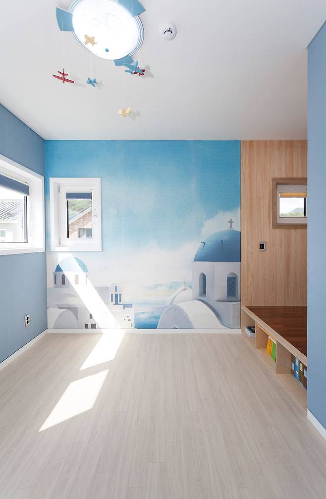 2층은 가족실을 사이에 두고 안방과 아이의 방을 좌우로 분리한 구조이다. 2층의 압권은 좌측 아이 방의 이벤트 공간으로 꾸민 공부방, 그리고 그 안쪽에 숨겨진 계단에서 통하는 비밀의 공간인 다락방이다. 현관에서 계단실, 아이 방, 계단, 다락으로 이어지는 동선이 마치 어릴 적 갖고 놀던 바람개비를 돌리는 듯하다. 바람개비처럼 돌면서 마치 보물찾기하듯이 오르다 보면 나뭇잎이 달린 나무줄기, 비행기 모빌, 그리스 산토리니 그림, 그리고 정점인 다락에 다다르면 천창에 환한 햇살이 모습을 드러낸다. 부부 역시 공부방과 다락을 획기적인 공간으로 꼽는다.