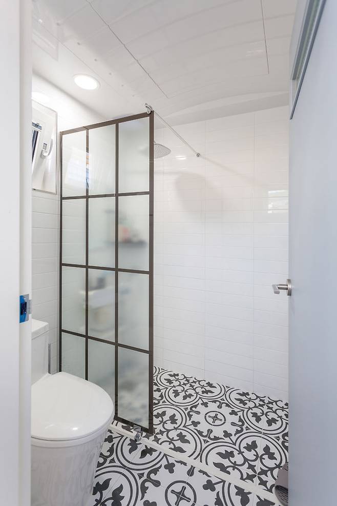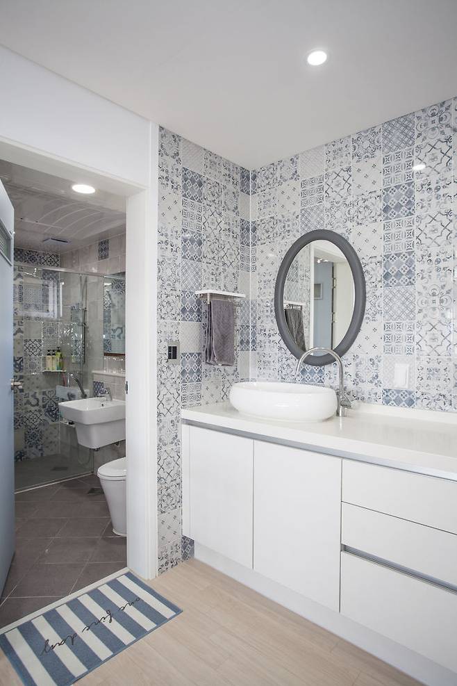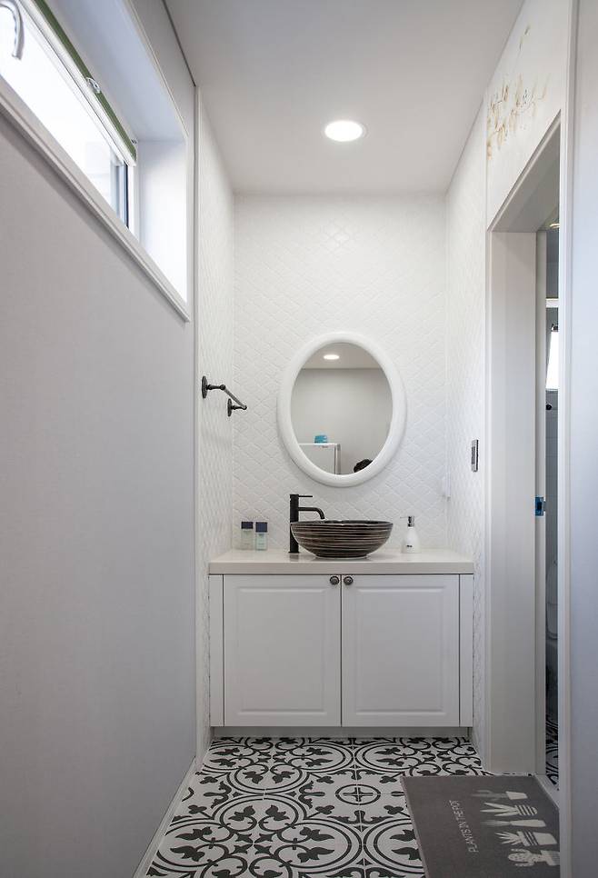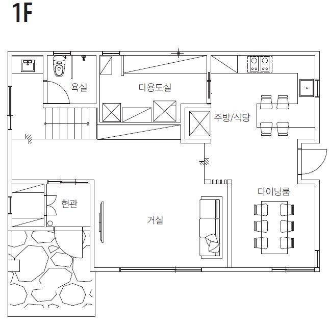 1층에는 현관과 계단실에서 가까운 곳에 귀가 후 또는 식사 전에 사용하기 편한 개방형 세면대가 있다. 그리고 현관이나 거실에서 보이지 않는 세면대 우측에 공용 화장실을 배치해 두 명이 동시에 프라이버시를 확보하면서 사용할 수 있다.